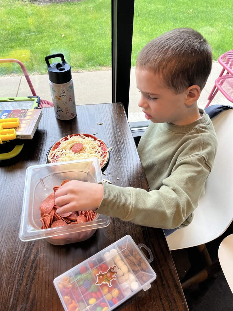 Miss Clark's class had a chance to go to Donatos Pizza to see how pizzas are made. They got to make their very own and see them come out of the ovens on the rollers. As you can see, cheese is a big hit!